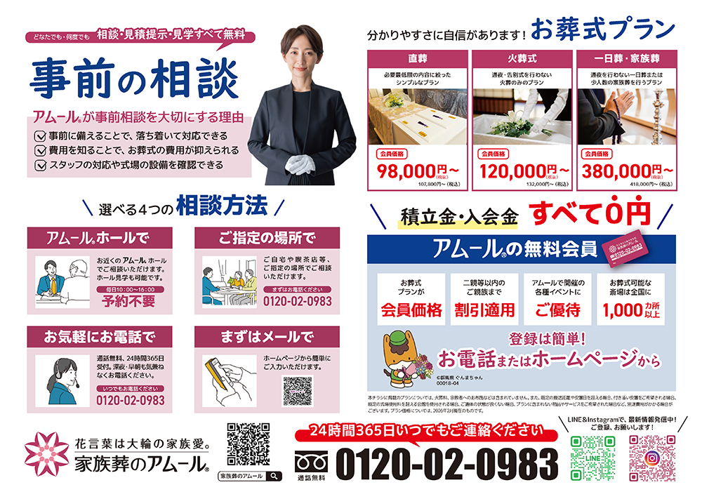 高崎市/新聞社(上毛新聞)"お葬式のご案内を新聞折込みへ配布"【更新案内】 高崎市の家族葬 アムール(群馬県全域対応)ご案内が新聞折込みにて、令和8年2月12日(木)、26日(木)に配布されます。 さらに、タウンぐんまにて、令和8年2月21日(土)に配布されます。 チラシをご持参の上、アムールホールへ来館のご相談をいただいた方に、総額¥50,000相当のお得なプレゼントをご用意しております。 365日・24時間(無料電話)0120-02-0983まで、お気軽にご連絡を下さい。 高崎市の家族葬 アムール